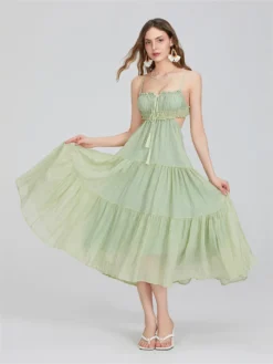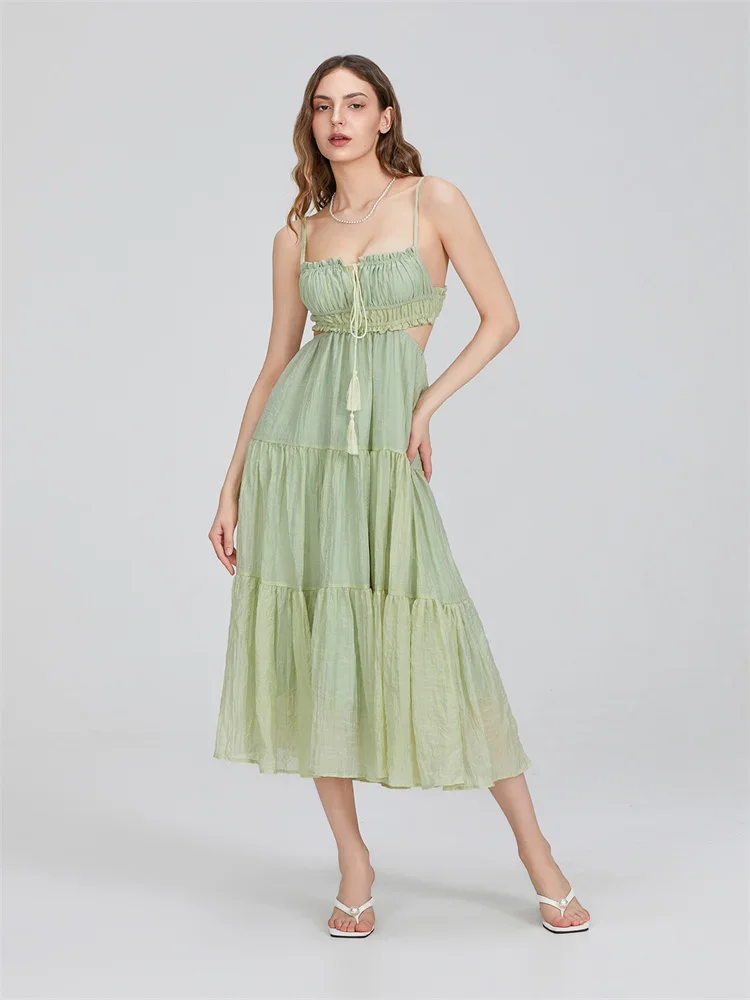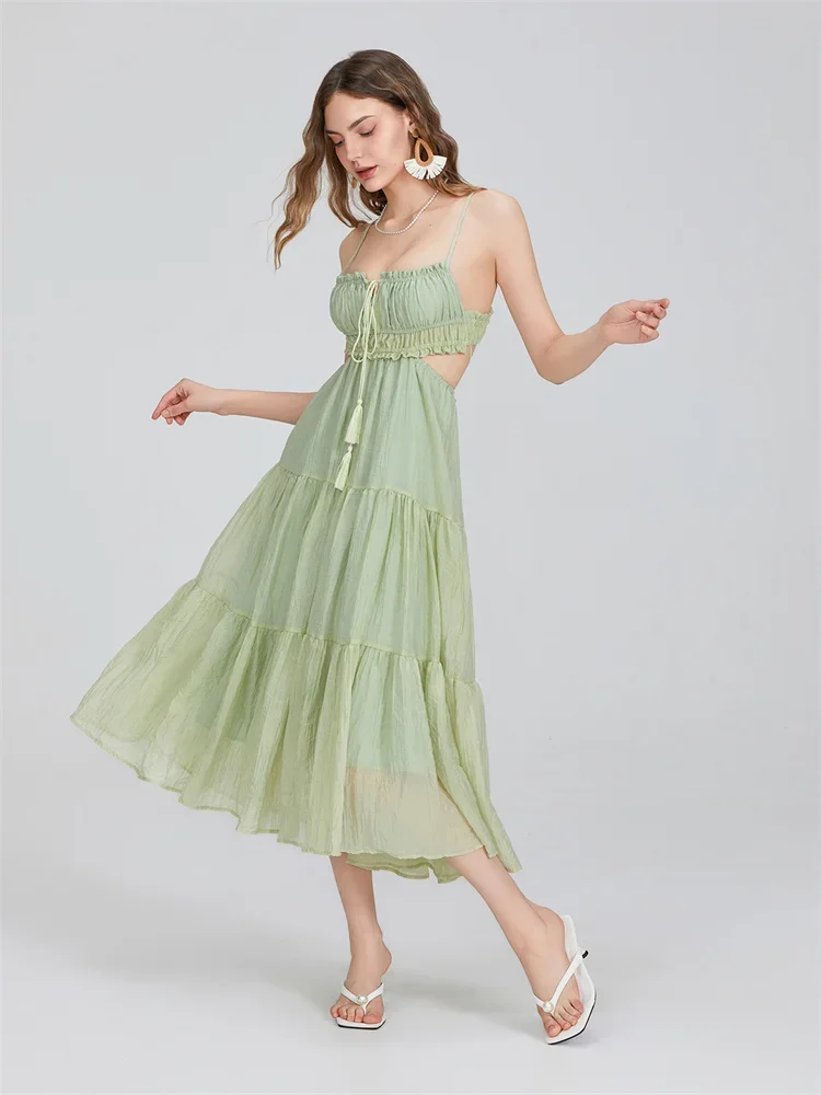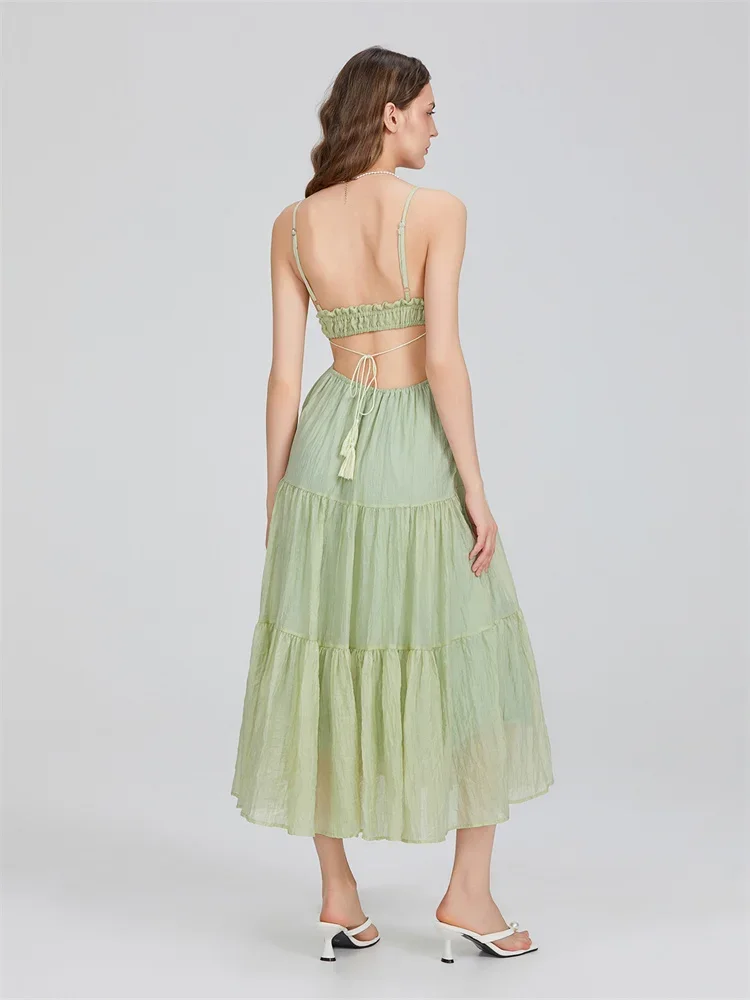 Women Summer Casual Long Dress Solid Color Tie-Up Sleeveless Backless Dress Fashion Party Sling Dress