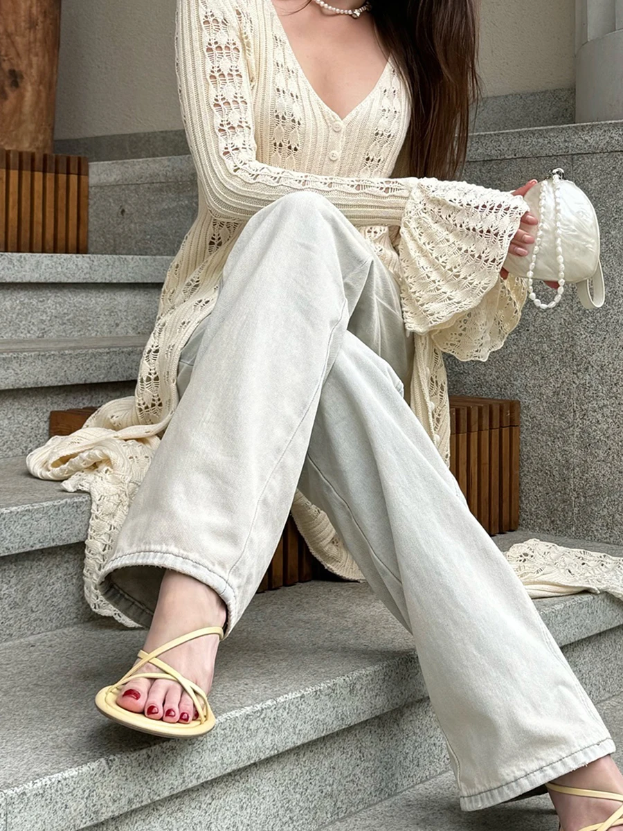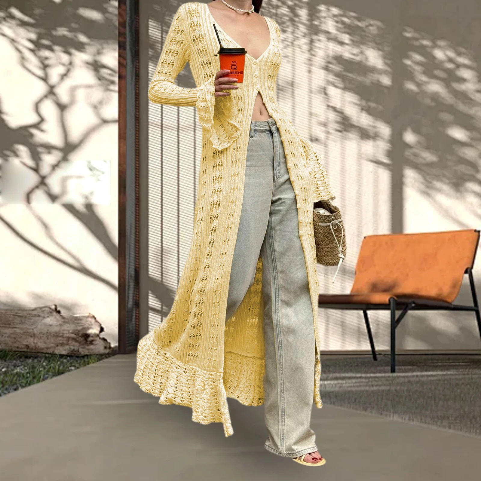 Women Knit Dress Long Sleeve Button Closure Cardigan Hollow Out Long Dress Top for Daily Street Summer Fall