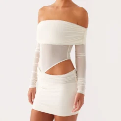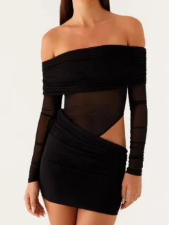Women Mini Off Shoulder Dress Slim Ruched Solid Color Cut Out Long Sleeve Backless Short Mesh Bodycon Dress for Party Club