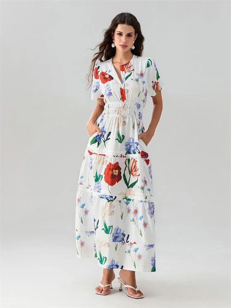 Women Long Dress Smocked Waist Pintucked Hem Side Slant Pockets V-Neck Short Sleeve Flowy Dresses