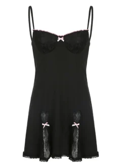 Sleeveless spaghetti strap dress, bowknot decor, contrast color, lace trim, simple and stylish.