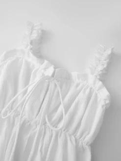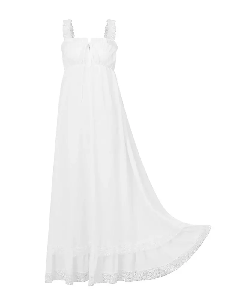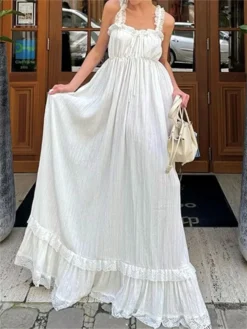 Women Long Tank Dress Lace Trim Tie-up V Neck Sleeveless Backless Empire Waist Ruffle Dress for Evening Party Club