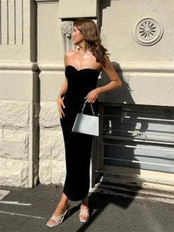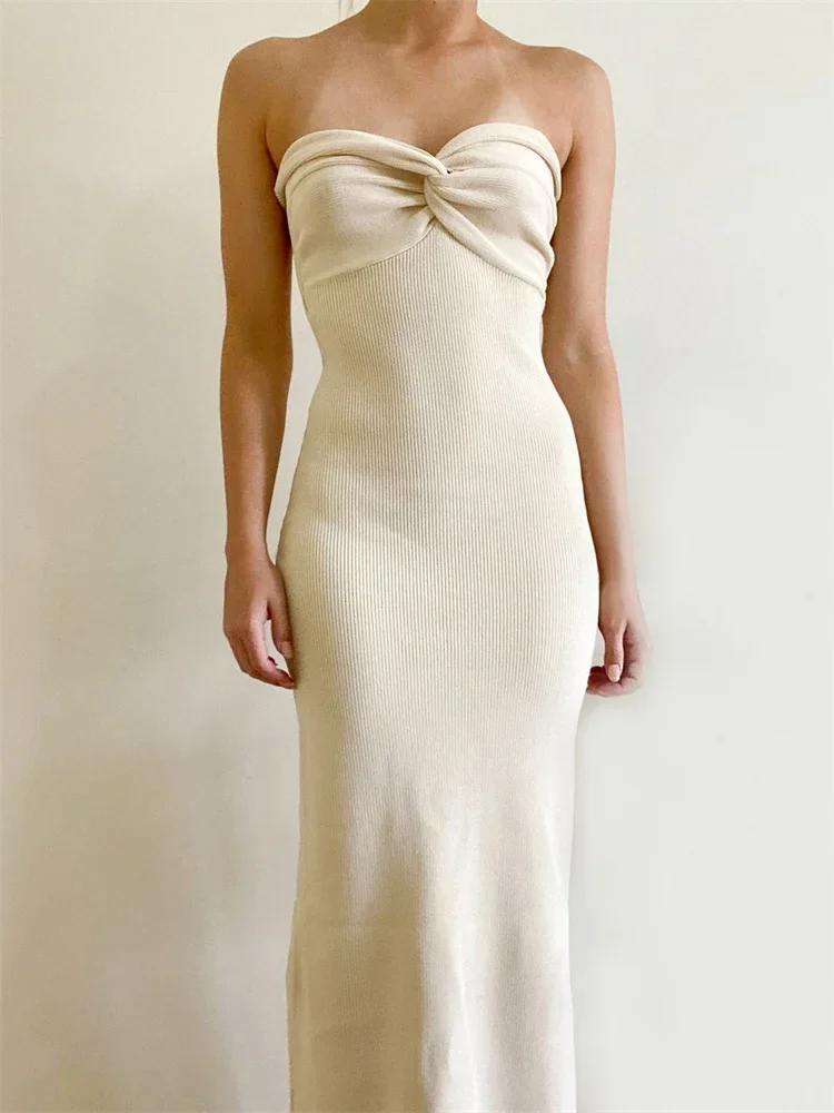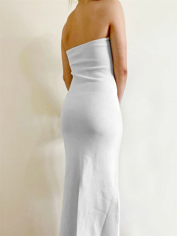 Women Y2K Knitted Long Dress Solid Color Strapless Bodycon Pencil Slit Tube Dress Summer Fall Sexy Elegant Chic Dresses Female
