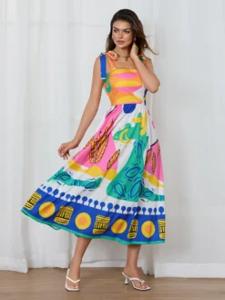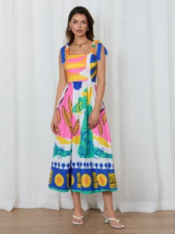 Women’s Summer Dress Tie-up Straps Sleeveless Square Neck Flowy Long Dress Beach Holiday Casual Loose Streetwear