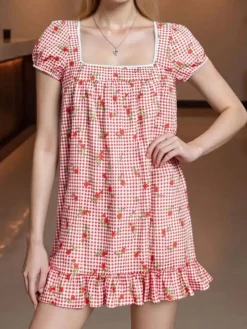 Women Summer Floral Short Dress Puff Sleeve Square Neck Tie-up A-line Dress Casual Vintage Bohemian Party Dresses Female