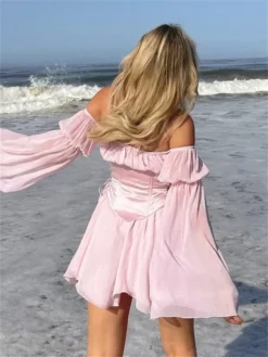Women Vintage Dress Off Shoulder Long Sleeve Pleated Dress with Bandage Corset Summer Fall Party Evening Elegant Dresses