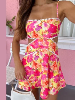 Women’s Summer Mini Cami Dress Sleeveless Open Back Cutout Floral Spaghetti Strap Dress
