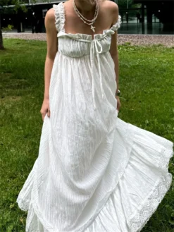 Women White Long Dress Lace Trim Tie-up V Neck Sleeveless Ruffle Loose Tank Dress for Evening Party Club Bohemian Summer