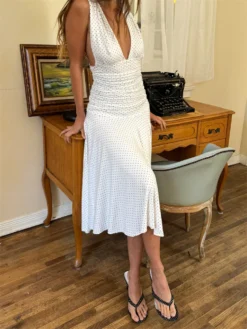 Women’s Tank Dress Stylish Dot Print Pleated Waist Sleeveless V Neck A Line Dress for Summer Holiday Casual